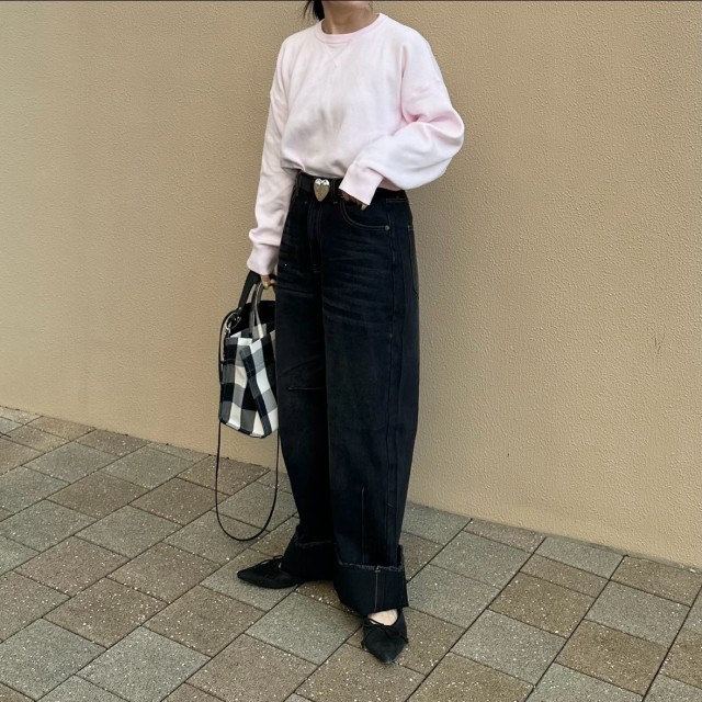 普段ベーシックカラー派だけど、春になったら明るいペールトーンが着たい気分。普段用にカジュアルなトップスを買い足すのなら、ペールピンクのスウェットを選んでみては? ワイドパンツを合わせるときはウエストインもしくは前だけインするのがおすすめ。さらにベルトで引き締めるといつもと印象を変えられます。