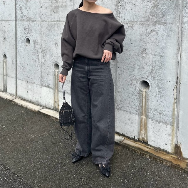 今季ぜひ取り入れてみたいのはアシンメトリーなオフショルダーのトップス。大人世代にはリブニットのようなタイトなデザインよりも、スウェットなどラフなトップスの方が気軽に着こなせておすすめ。いつものワイドパンツに合わせるだけで即こなれ見えが叶う一着です。