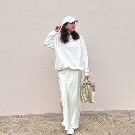 ちなみに「全身真っ白で気恥ずかしい」と感じたら、ベーシックカラーのカーディガンやジャケットをプラスすればOK。これだけで着こなしやすくなりますよ。