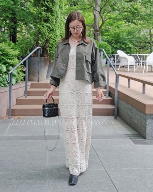 【40代のきれいめコーデ2026春】レースワンピース×ミリタリーアウターで甘辛に