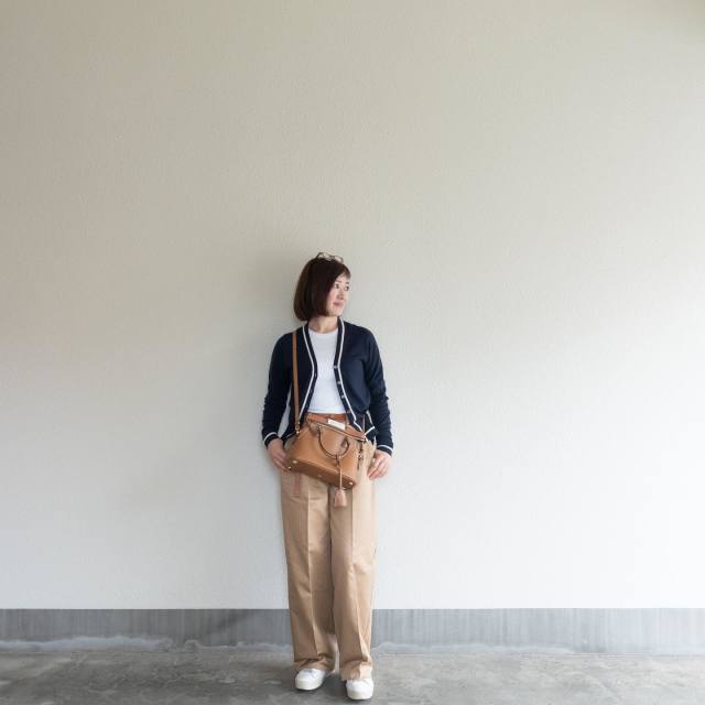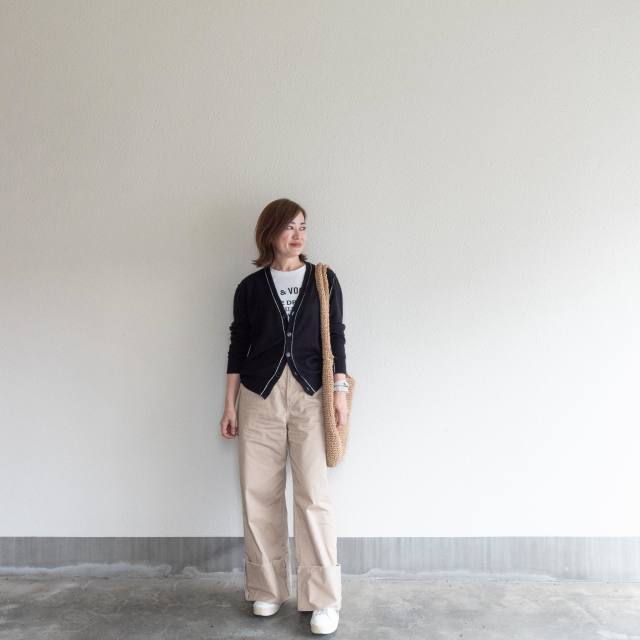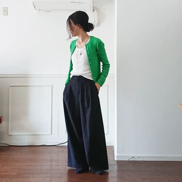 コンパクトなカーディガンは大人にとって「ヤボッたく見えるかも?」と感じることも。そこでおすすめなのがワイドパンツとの着合わせです。カーディガンがボリューミーなパンツを引き締めて、メリハリある着こなしに。
