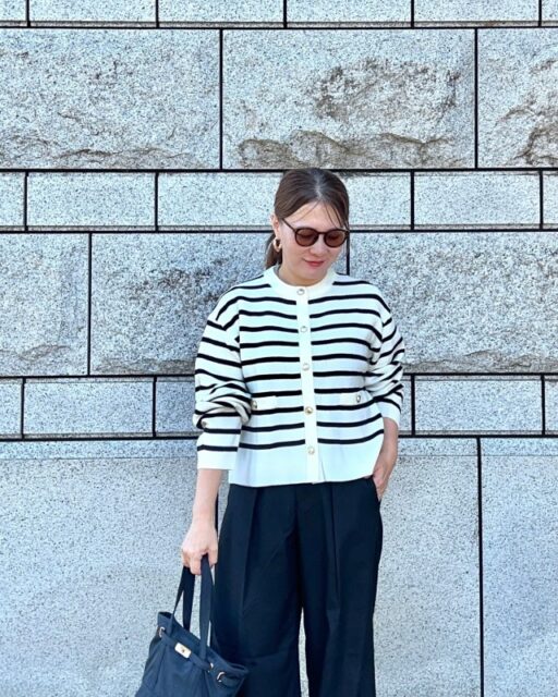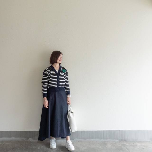カジュアルなボーダー柄のカーディガンは春らしさたっぷり。大人世代は前を閉めて着こなすのがおすすめです。コーデにきちんと感が加わり大人っぽさがグンとアップしますよ。加えてクリーンなパンツやスカートに合わせると50代に馴染む装いに。