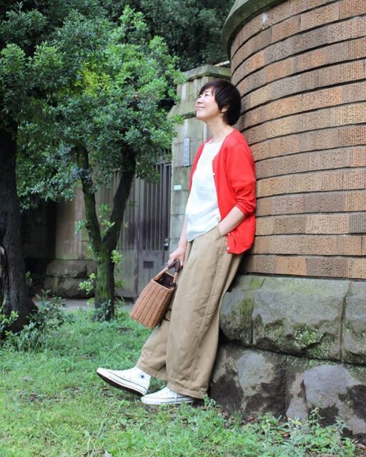 50代にイチ押しのカーディガンは「きれい色」。発色のいい服は派手見えしそうですが、ベーシックなカーディガンならインパクトも控え目です。下に白Tシャツ・プルオーバーを着るとカーディガンが映え、コーデがいっそう華やぎますよ。