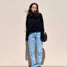 【テーラードジャケットのカジュアルコーデ2】ワイドデニムパンツに合わせる