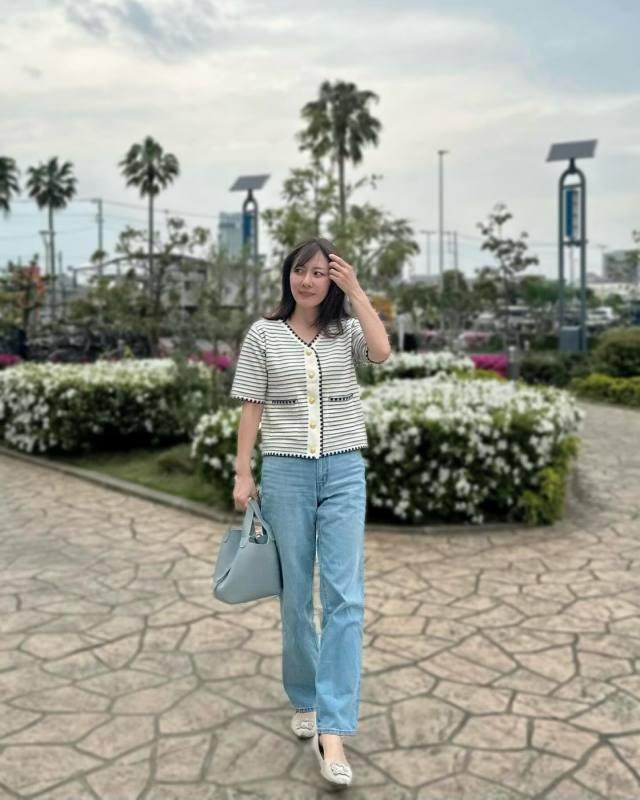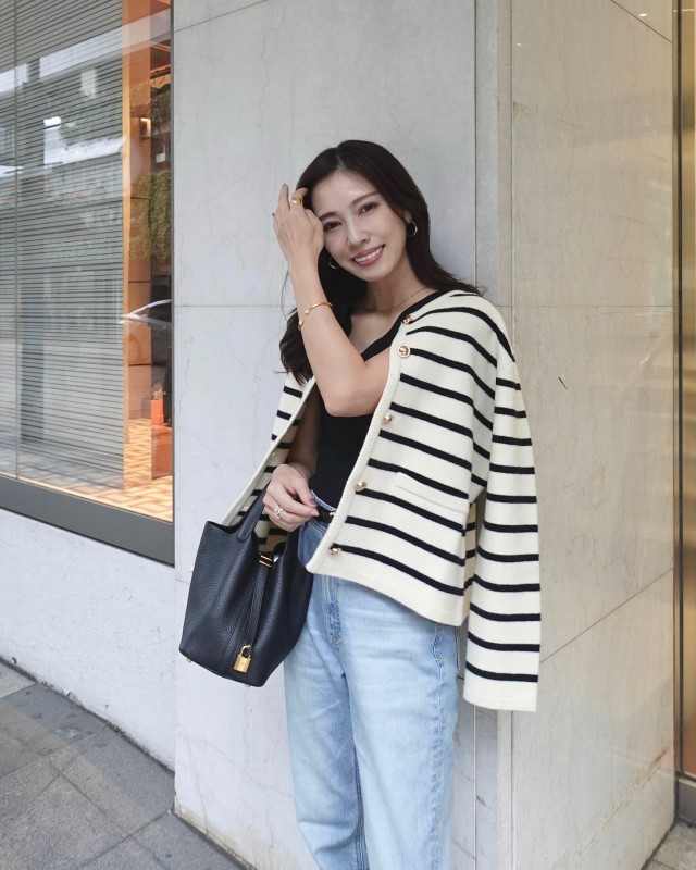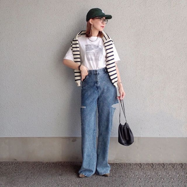 デニムパンツ×ボーダー柄カーディガンのコーデ