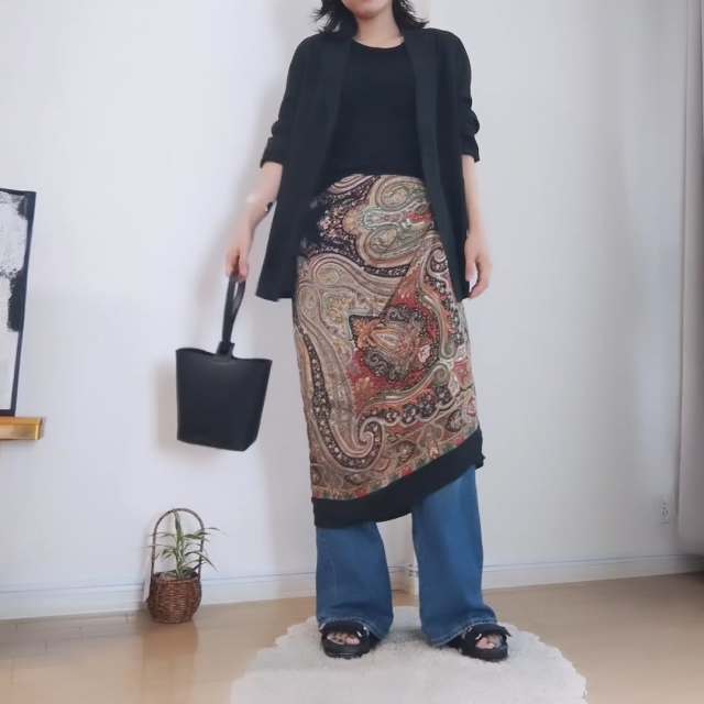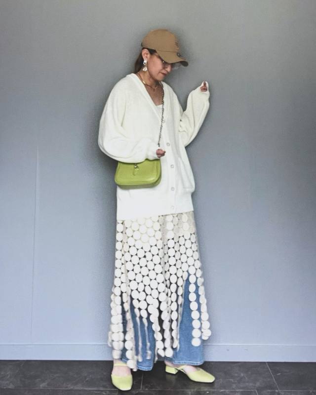 デニムパンツ×カーディガン×スカート・ワンピースの重ね着コーデ