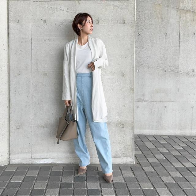デニムパンツ×カーディガン×白Tシャツのコーデ