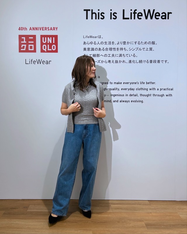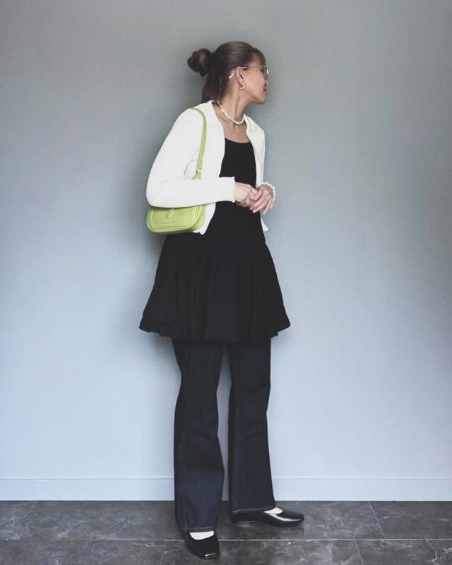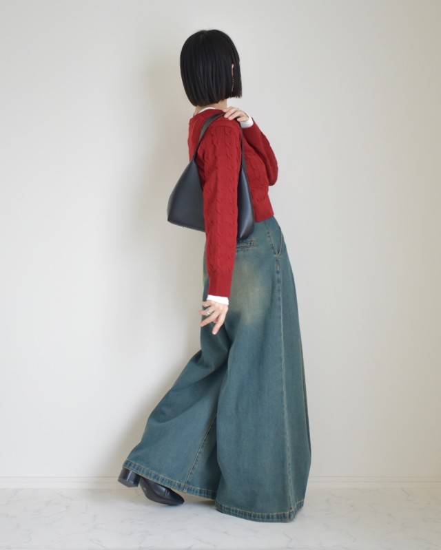 デニムパンツ×レイヤード風カーディガンのコーデ