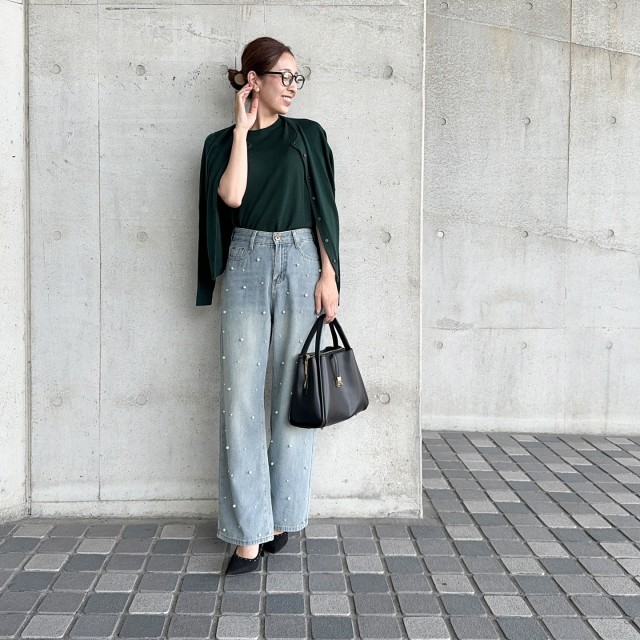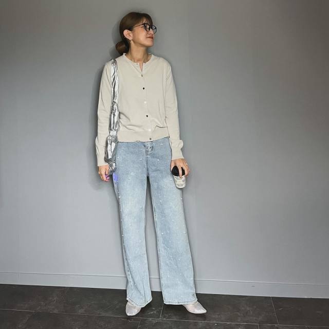 パール付きデニムパンツ×カーディガンのコーデ