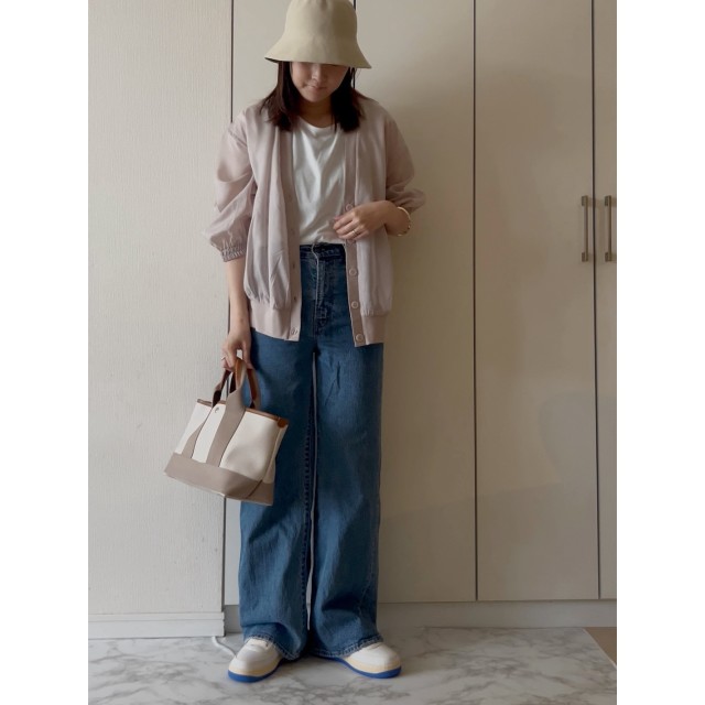 デニムパンツ×シアーカーディガンのコーデ