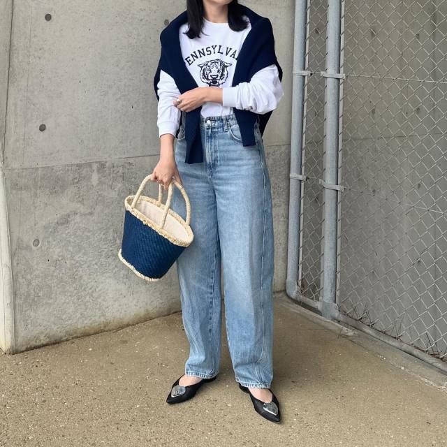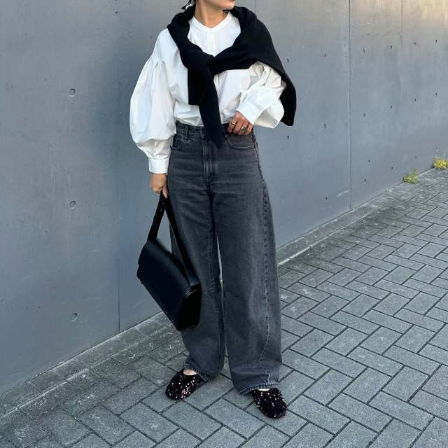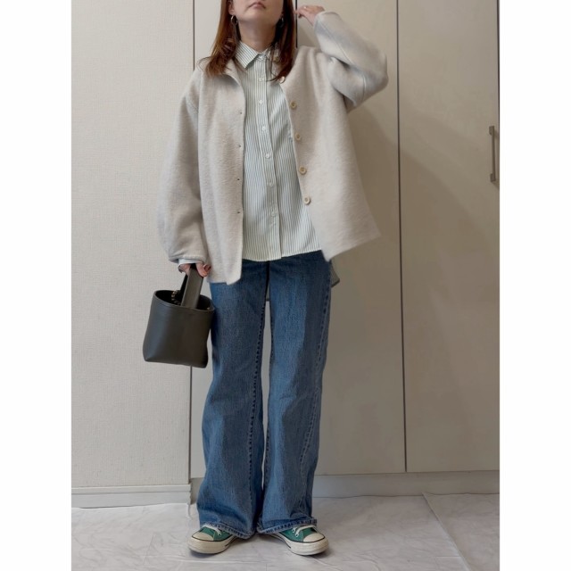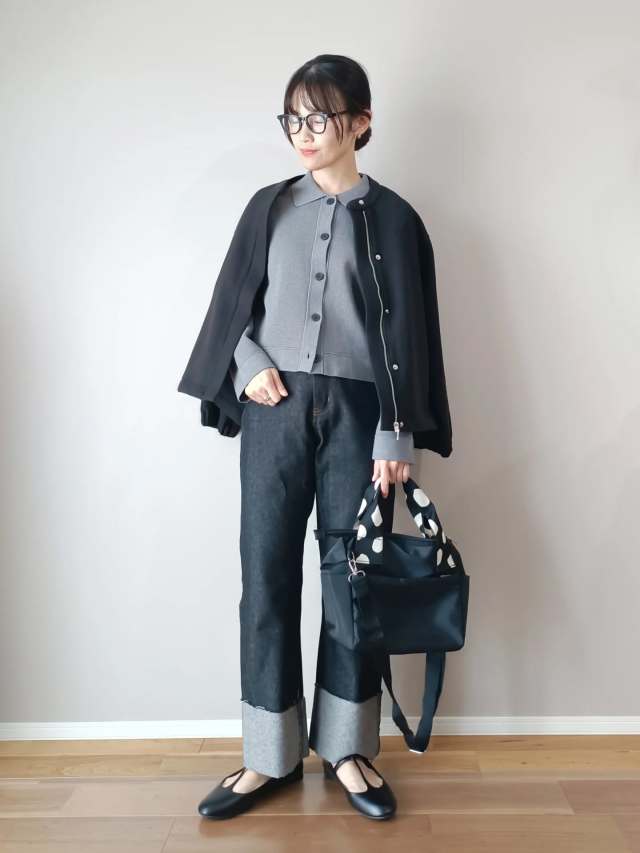 デニムパンツ×襟付きカーディガンのコーデ
