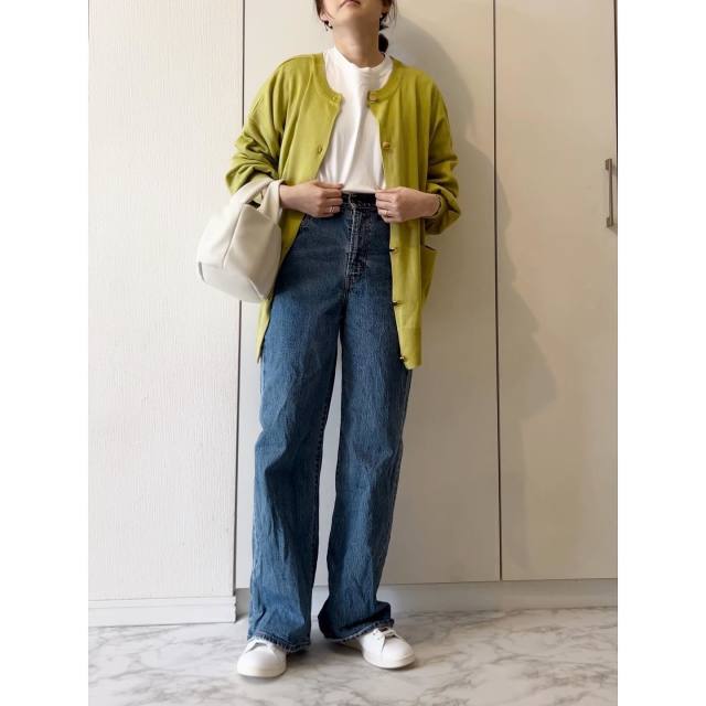 デニムパンツ×きれい色カーディガンのコーデ