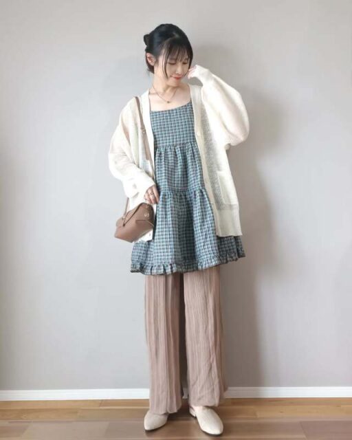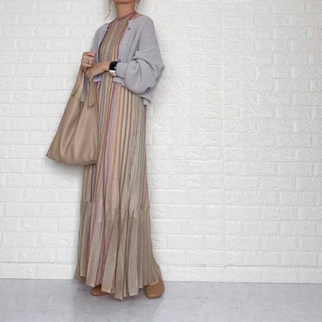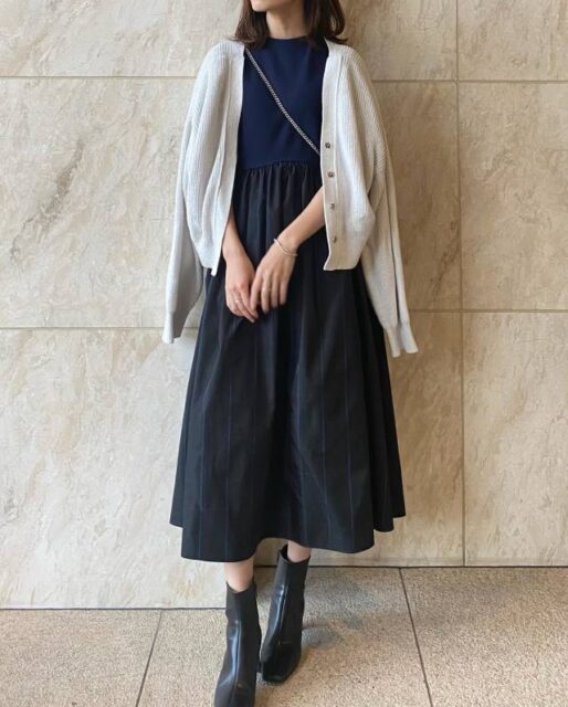 お出かけにぴったりなのが「ワンピース」とカーディガンの組み合わせ。シンプルなカーディガンを前を開けて羽織れば、ボレロのように見えてきれいめな装いに。
