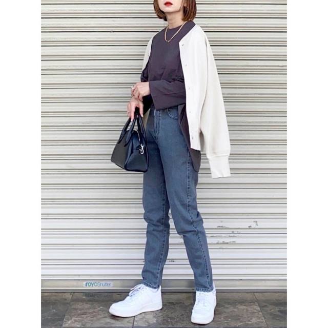 ダークカラーの服を春っぽく着こなしたいときは「白カーディガン」がお役立ち。黒やチャコールグレーなど暗い色の服に映えて、コーデの鮮度がアップ。クリーンな色のおかげで春らしさも高まります。
