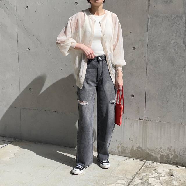 春の終わりまで着られるのが「シアーカーディガン」。透け感のあるカーディガンは見た目・着心地ともに爽やかです。下に長袖を着れば4月らしい着こなしに、タンクトップなどノースリーブにチェンジすれば5月末まで使えます。涼感素材のシアーカーディガンなら、夏の紫外線・エアコン冷え対策にも役立ちますよ。
