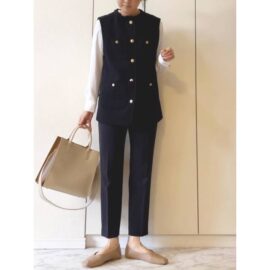 「前開きのニットベスト」はシフトシーズンの時期こそ本領発揮。薄手のプルオーバーに羽織ればほっこり見えず、鮮度のある着こなしに。気温調節できるおしゃれなスタイリングが楽しめます。
