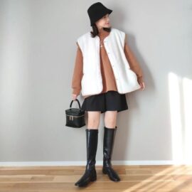 毛足が長いファーベストは時期外れに感じますが、「白のボアベスト」なら大丈夫。色味が春らしいので、ボア生地のベストが3月のコーデにマッチします。スウェットパンツやロングTシャツを合わせれば軽やかなルックスに。