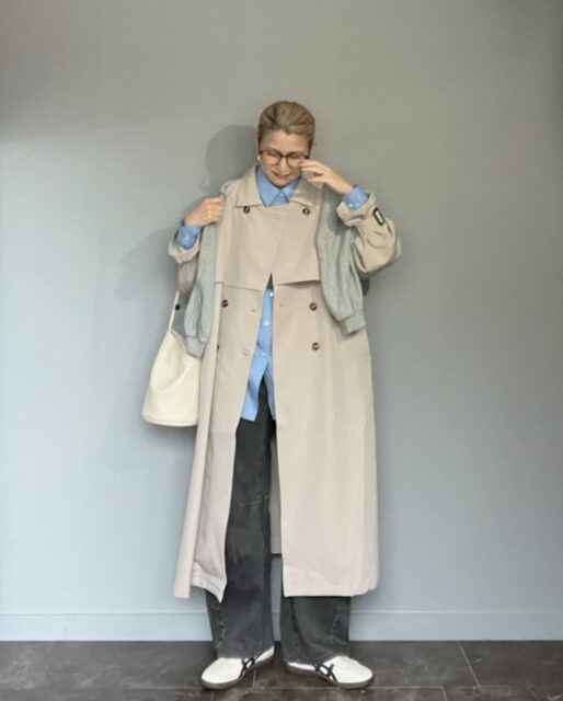 こちらでは正統派のトレンチコートを主役に、インナーにブルーシャツを仕込んで上品なアクセントをプラス。またブラックデニムパンツとスニーカーのアイテム選びも参考にしたいポイント。クラシックなコーデに抜け感が加わり、大人にちょうどいいバランスに。ボブヘアはあえてタイトにまとめるとシャレ感がより引き立ちます。