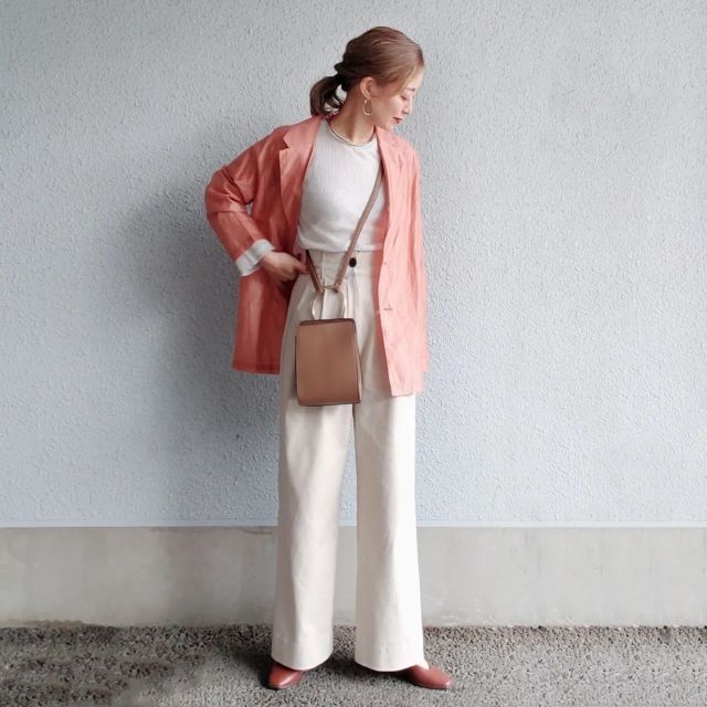 こちらは、ピンクのカラージャケットにブラウンショルダーバッグをIN。中にバッグを斜めがけすることで、ジャケットの形を崩さすにおしゃれを楽しめるんです。カラージャケットが主役のスタイリングだからこそ、このバッグの持ち方が生きてきます。
