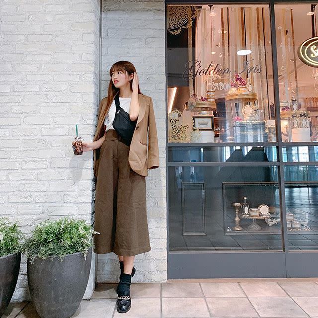 次にご紹介するのは、パンツセットアップのハンサムなジャケットコーデとミニショルダーバッグの組み合わせ。コロンとしたバッグのフォルムが、きれいめなスタイリングに親しみやすさをプラスしてくれますよ。