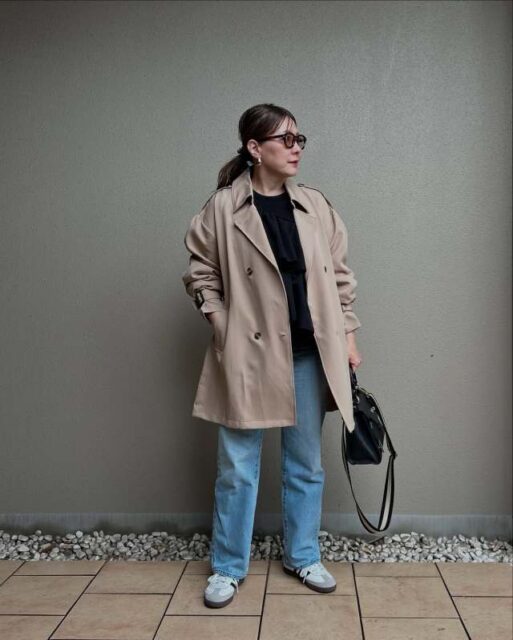 ミドル丈トレンチコート×ゆったりデニムパンツのコーデ