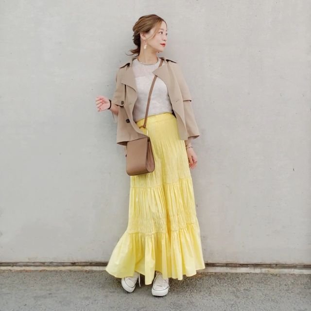 ショート丈トレンチコート×春色スカートのコーデ