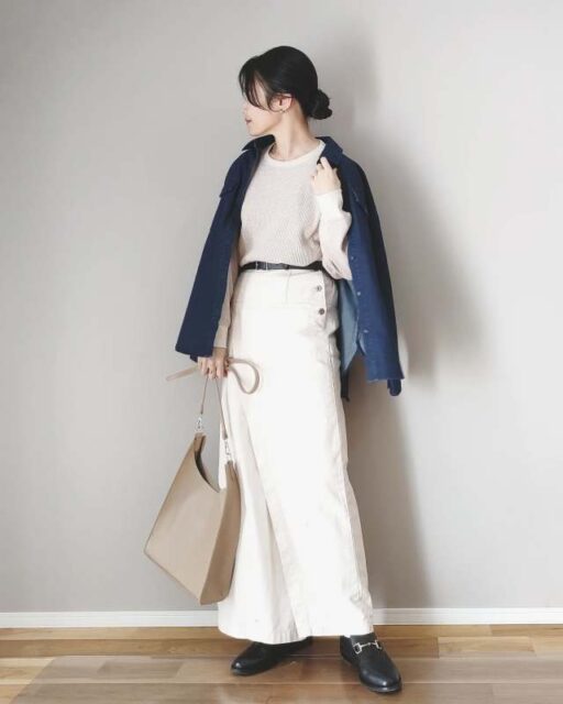 手持ちの「カーディガン」もアウター代わりに活用できます。サッと脱ぎ着しやすく、ちょっと肌寒い日のコーデにもぴったりです。前を閉めて着こなせばクリーンなルックスに。