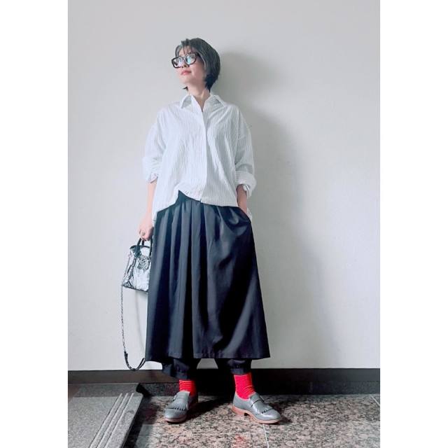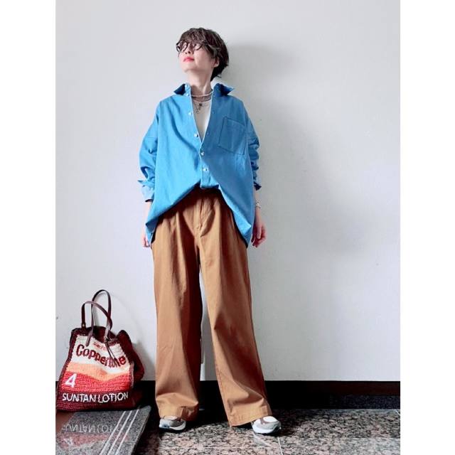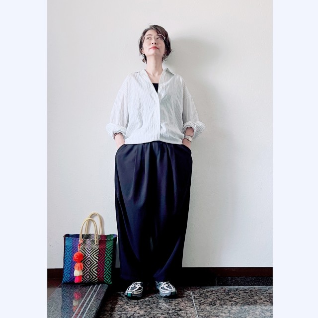 ボリューミーなワイドパンツはトレンド感と体型カバーを兼ね備えており、50代にぴったり。そんなダボッとしたパンツに合わせたいのがクリーンな襟付きシャツです。