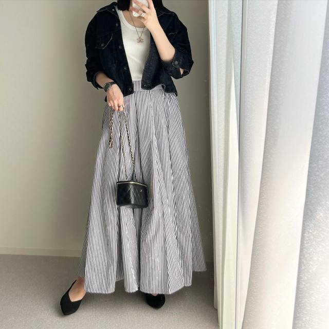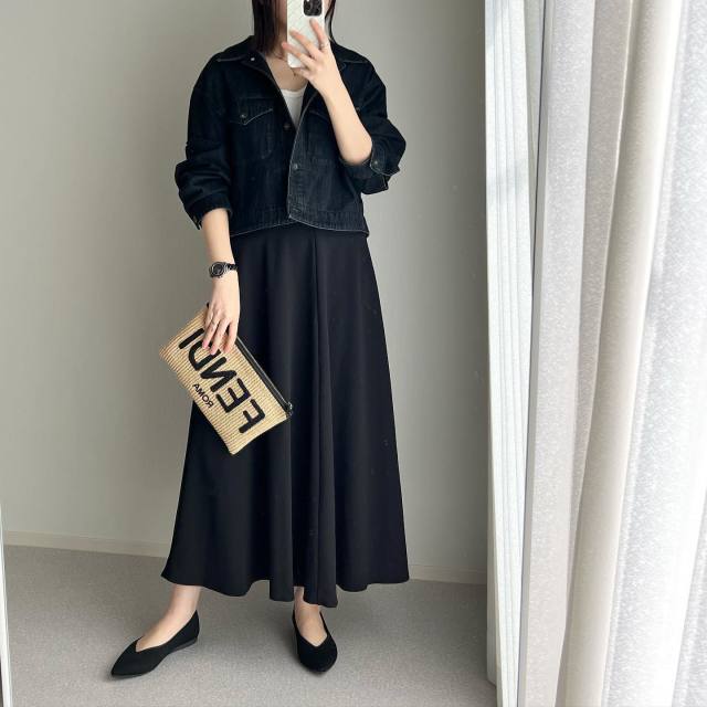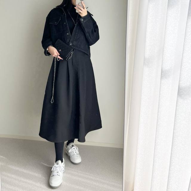 黒デニムジャケット×ボリュームスカートのコーデ
