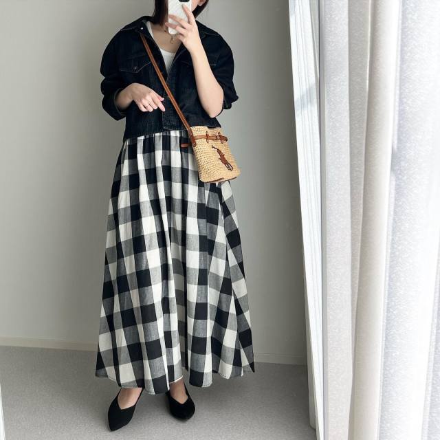 黒デニムジャケット×柄スカートのコーデ