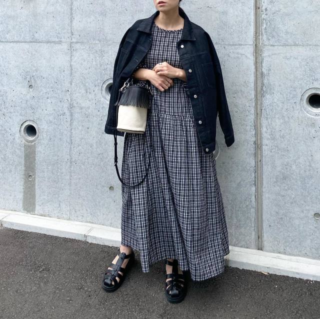 黒デニムジャケット×ワンピースのコーデ