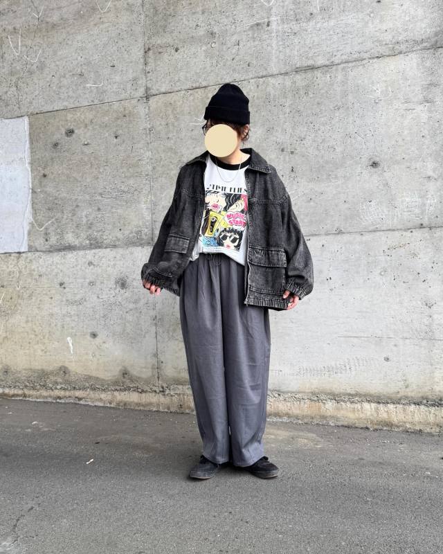黒デニムジャケット×プリント・柄トップスのコーデ