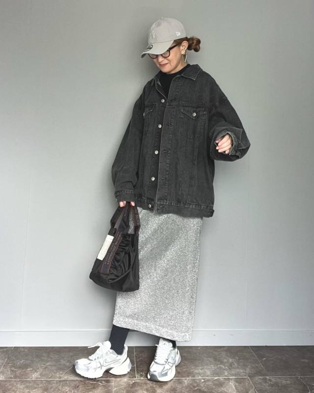黒デニムジャケット×タイトスカートのコーデ