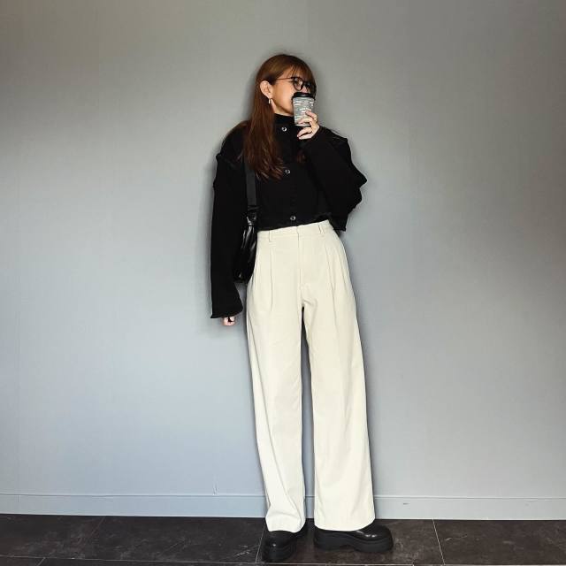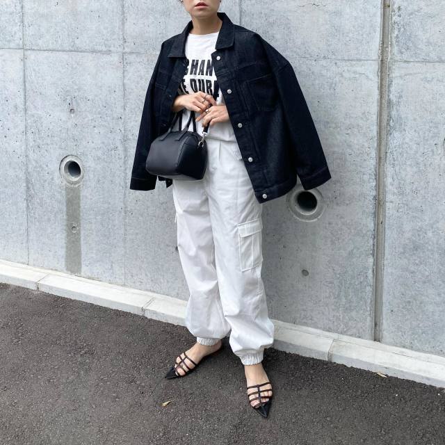 黒デニムジャケット×白パンツのコーデ