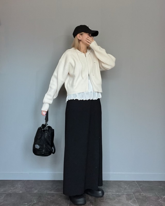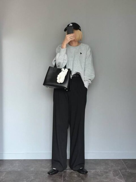 グレー・ネイビー・黒など、ダークトーンのスタイリングには白キャップがおすすめ。濃色の装いに軽やかな抜け感が加わり、重たく見えがちな配色コーデに程よいメリハリが生まれます。