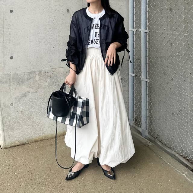 アウターなのに軽やかな「シアーブルゾン」はバルーンスカートにハマる一枚。生地に透け感があるので着膨れせず、ボリュームのあるバルーンスカートにぴったりマッチします。羽織るだけで春らしい着こなしに。