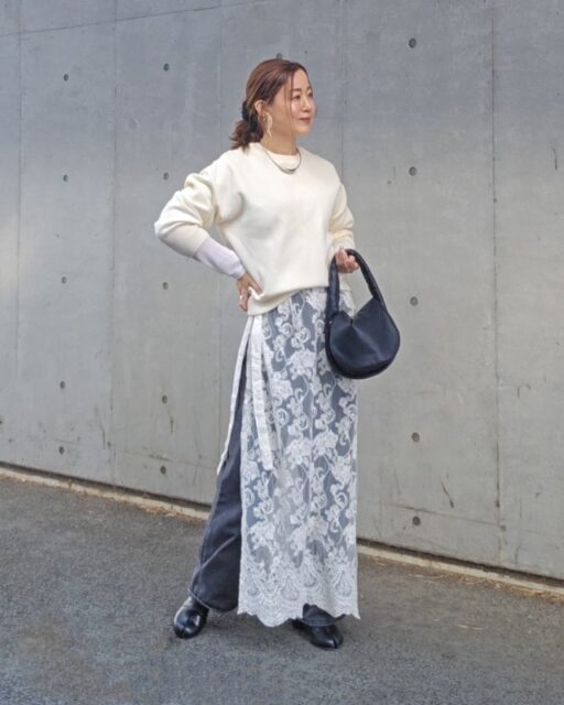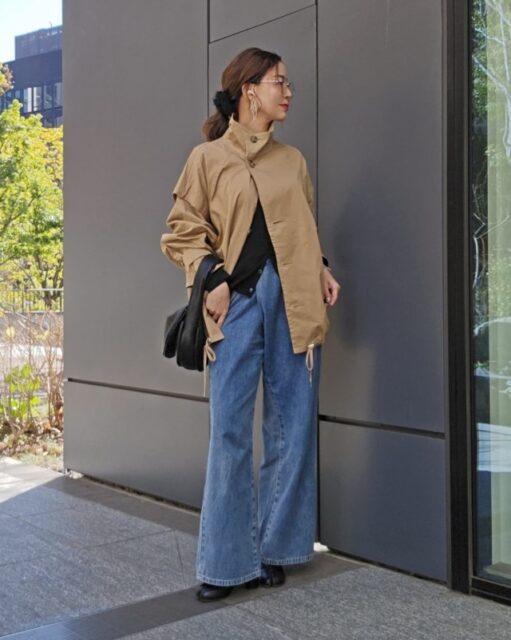 このときシャツ・ブラウスはゆったりめを選んで裾を出すのがコツ。リラクシーに着こなすことで今どきのルックスに決まります。