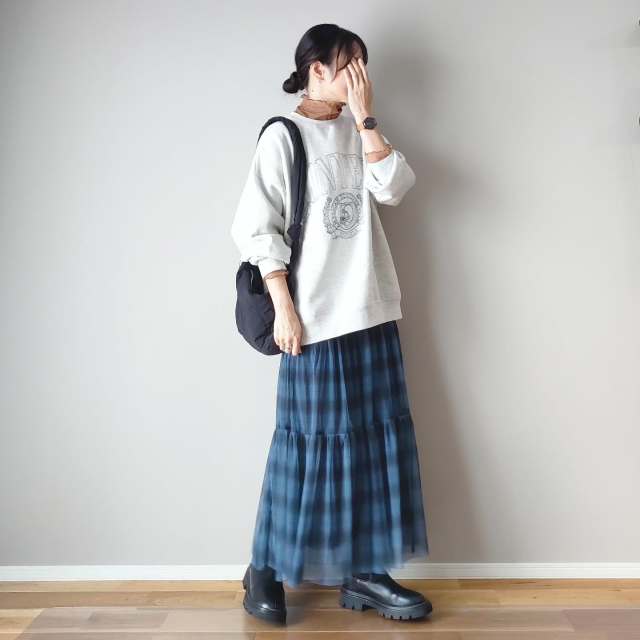 スウェット1枚では寒いときにおすすめなのがこちらの着こなし方。シアー生地のハイネックプルオーバーを下に重ね着すると、おしゃれに決まりますよ。