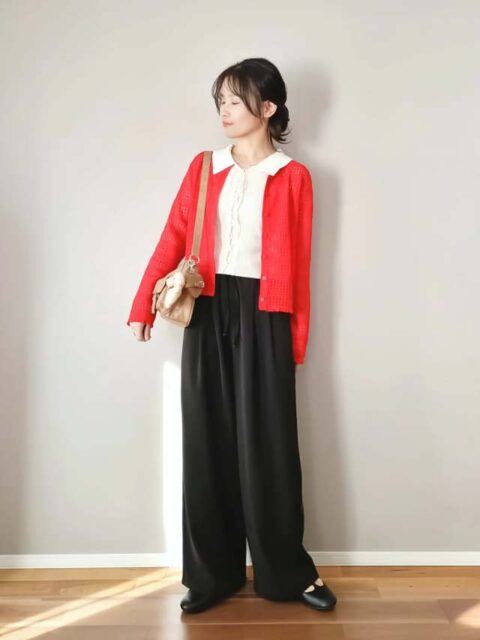 カーディガンをきれい色で取り入れればコーデのアクセントに。地味色のトップスやパンツを合わせても華やかで春ムードたっぷりに決まります。