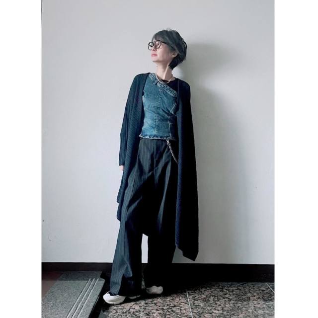 次にご紹介するのは、ロングカーディガンをハイウエストボトムスに合わせたスタイルアップコーデ。ロングカーディガンで肩周りをカバーし、ハイウエストにトップスをインすることで、上半身が小さく見える効果アリ。メリハリのあるシルエットでぐっと若々しく、旬なスタイルが完成します。