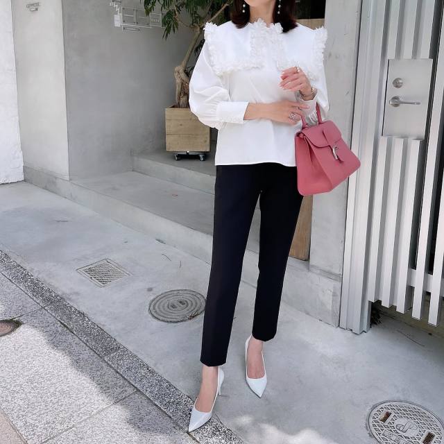 白ブラウス×黒パンツ×カラーバッグのコーデ