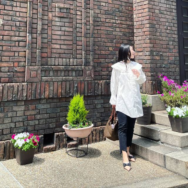白ビッグカラーブラウス×黒パンツのコーデ