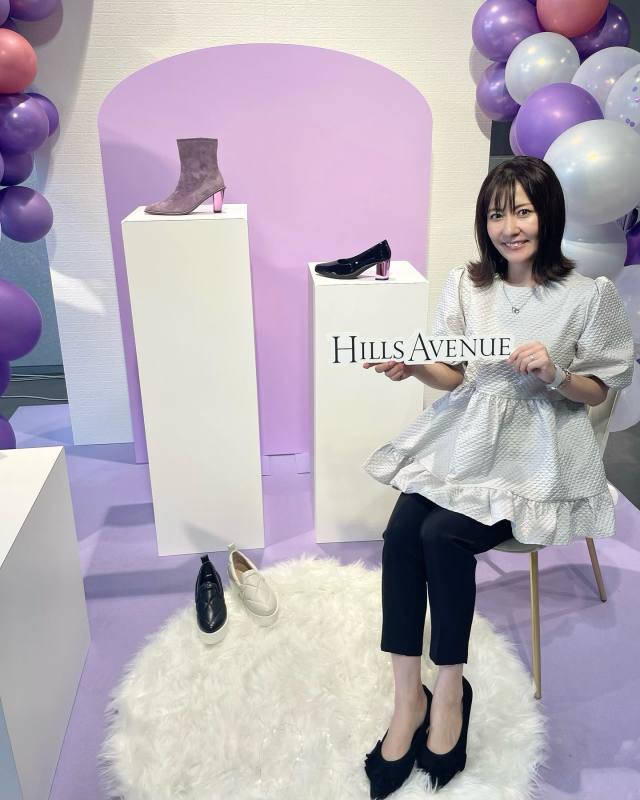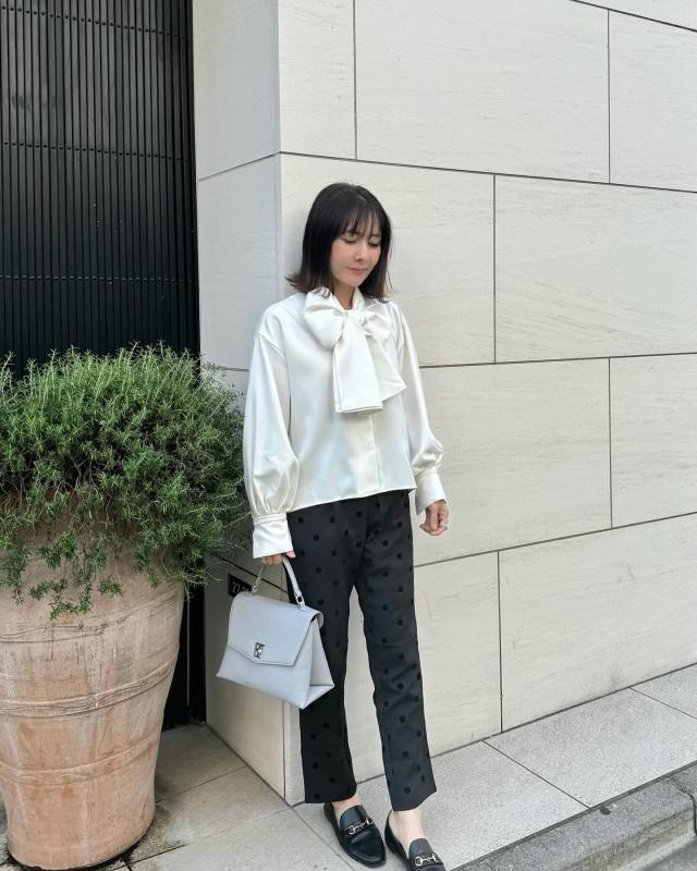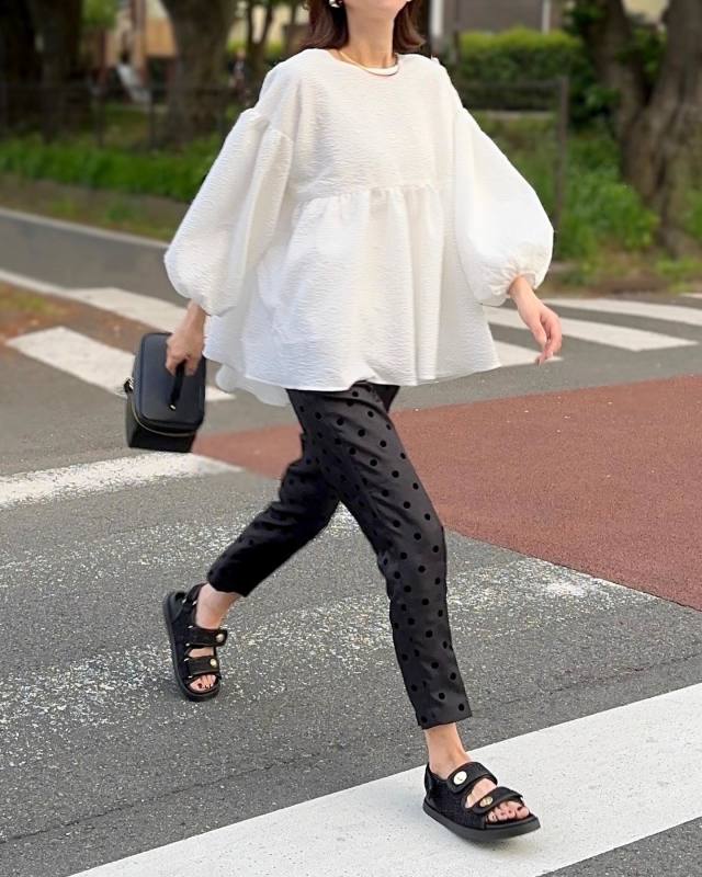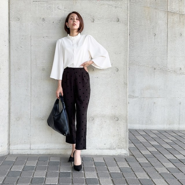 白ブラウス×黒ドット柄パンツのコーデ