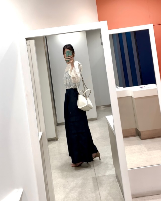 白ジャガードブラウス×黒パンツのコーデ
