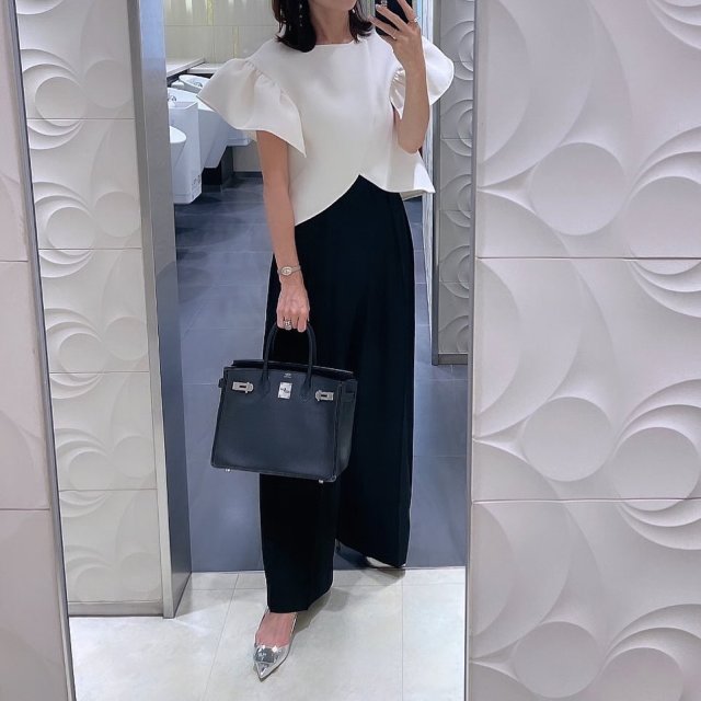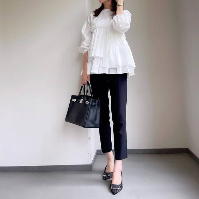白ペプラムブラウス×黒パンツのコーデ