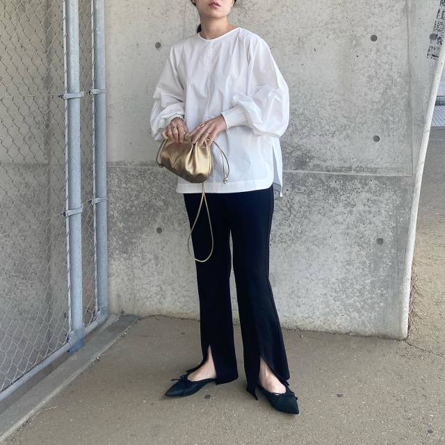 白ボリューム袖ブラウス×黒パンツのコーデ
