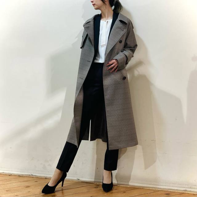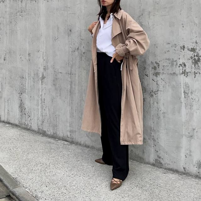 白ブラウス×黒パンツ×ロングコートのコーデ
