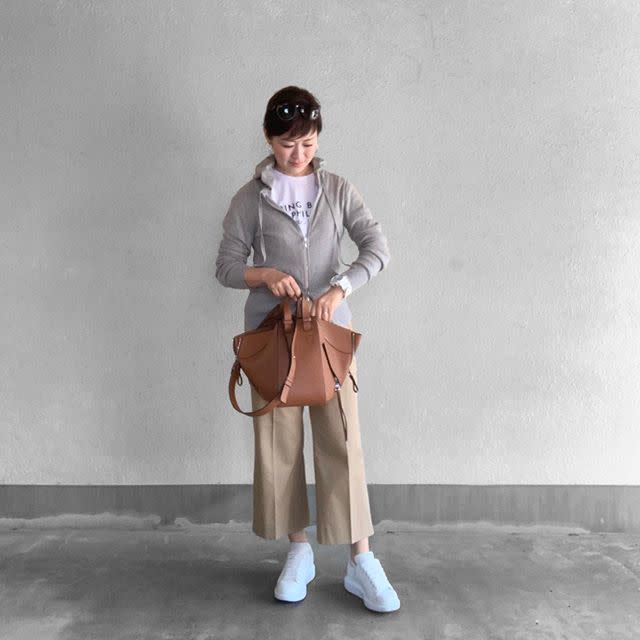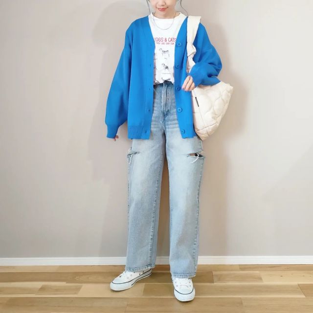 長袖トップス1枚では不安なら、カーディガンを重ねる着こなしはいかが? 寒いときは長袖トップスの上に着て、暑いときは肩に掛けてと、スムーズに体温調整できるコーデが目指せます!