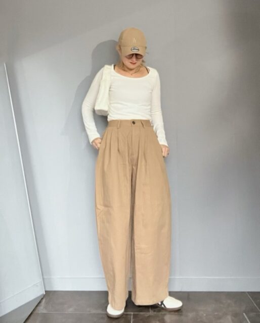 ヨガ仲間とヘルシーなオーガニックカフェでの女子会。ヨガやピラティスなど、日頃からスタイル維持を心がけている趣味サークルのメンバーと近所で気軽にランチをするなら、普段着できれいめにまとめるくらいがちょうどいいかもしれません。リラックス感のあるベージュワイドパンツをコーデのメインに選んだら、白のスリムなプルオーバーをウエストインしてメリハリよくまとめましょう。