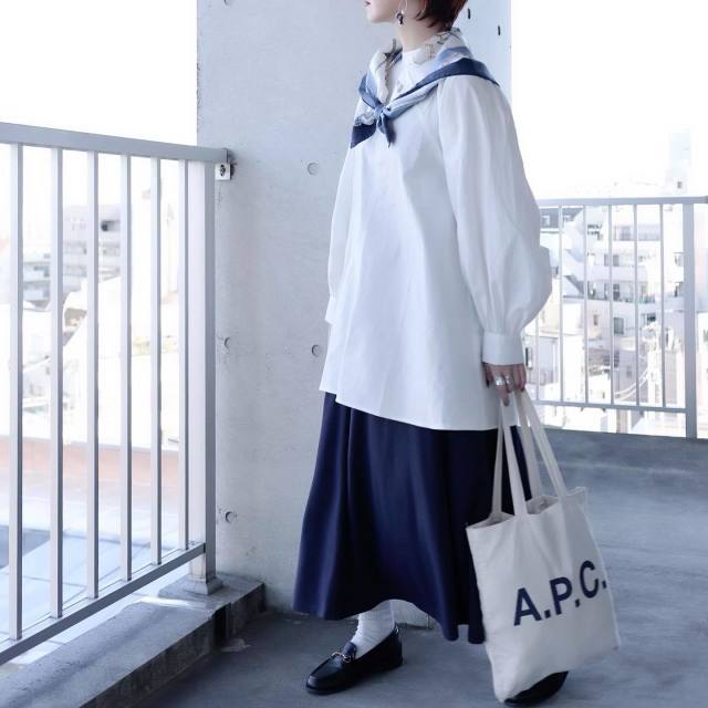 一枚あると使えるのがスカーフです。首にサッと巻くだけで冷え対策になりますよ。日中はスナップのように肩掛けしてアクセントにするのも素敵♪